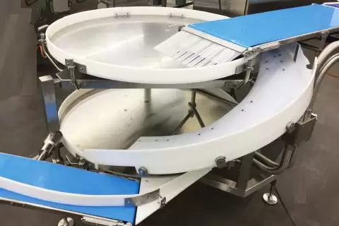 Bagetleri, sosisli çörekleri veya hamburgerleri hizalamak için otomatik sistem. Tasniflenmemiş ürünler, konveyör bantları ve oluklar vasıtasıyla, hızla dönen karusel masalarının iki seviyesinde sürekli olarak taşınır. Taşıma sırasında ürünler tek sıra halinde ayrılır ve dizilir. Yan kılavuzlarla bağlantılı olarak ürünler, içinden geçerken yanal olarak da hizalanabilir.